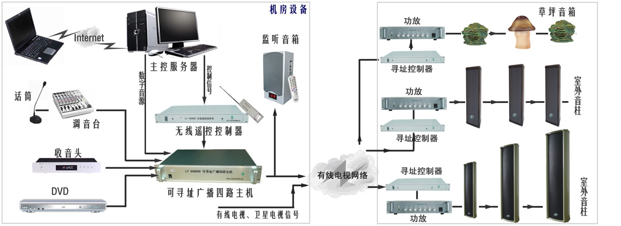 基于互聯(lián)網(wǎng)和局域網(wǎng)的純數(shù)字化網(wǎng)絡(luò)音頻廣播系統(tǒng),區(qū)別于傳統(tǒng)的模擬音頻、調(diào)頻、尋址和數(shù)控廣播的廣播系統(tǒng),流媒體(IP)智能數(shù)字廣播系統(tǒng)完全兼容的互聯(lián)網(wǎng)和局域網(wǎng),應(yīng)用TCP/IP協(xié)議,無需另行布線,可利用現(xiàn)有的校園網(wǎng)或內(nèi)部局域網(wǎng);嵌入式的硬件終端,能夠設(shè)置獨(dú)立的IP地址,可通過多層交換機(jī),通過主機(jī)可以任意控制每個終端的設(shè)置和播放,更可以在終端上選擇所需的節(jié)目內(nèi)容。