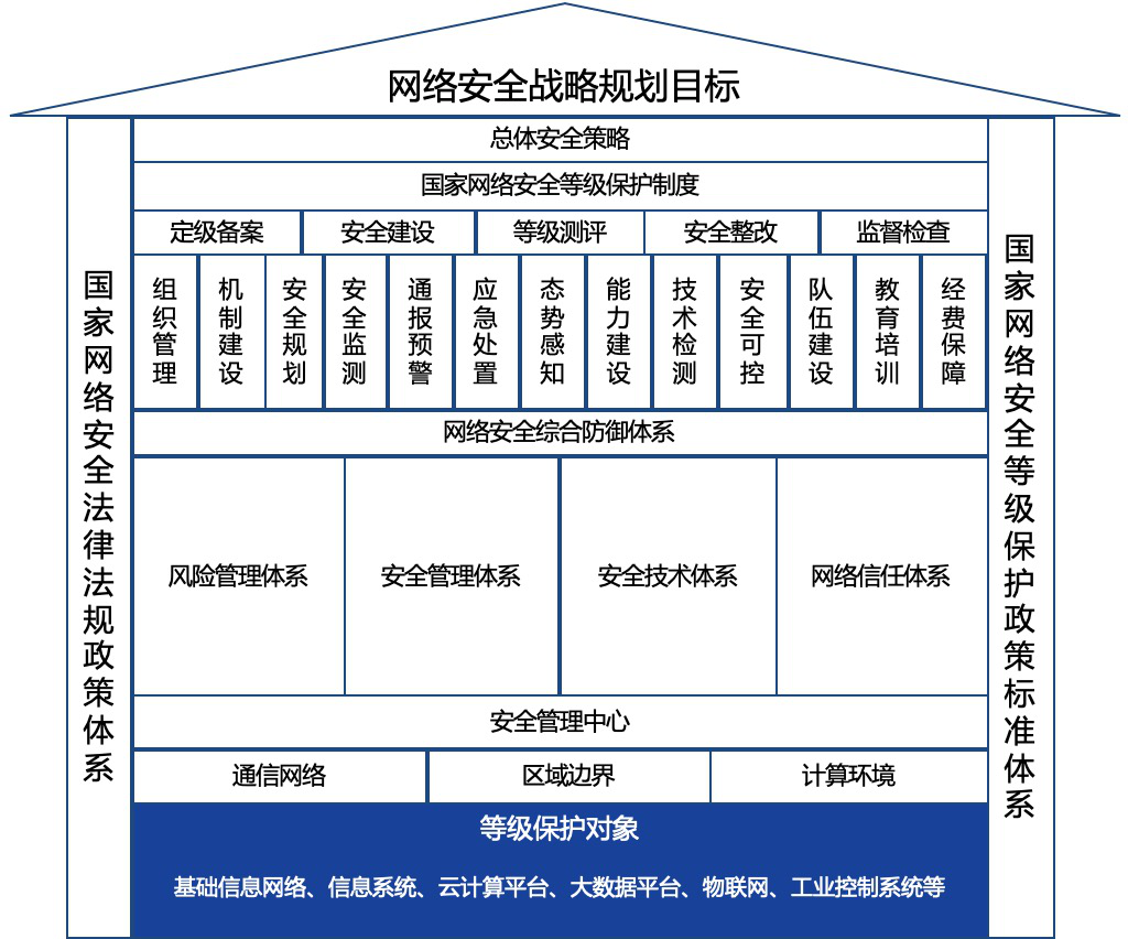 通過(guò)一個(gè)中心三重防護(hù)的體系框架來(lái)構(gòu)建安全機(jī)制和策略,針對(duì)等級(jí)保護(hù)特點(diǎn)建立安全技術(shù)體系和安全管理體系,構(gòu)建具備相應(yīng)等級(jí)安全保護(hù)能力的網(wǎng)絡(luò)安全綜合防御體系。依據(jù)國(guó)家網(wǎng)絡(luò)安全等級(jí)保護(hù)政策和標(biāo)準(zhǔn),開(kāi)展組織管理、機(jī)制建設(shè)、安全規(guī)劃、安全監(jiān)測(cè)、通報(bào)預(yù)警、應(yīng)急處置、態(tài)勢(shì)感知、能力建設(shè)、技術(shù)檢測(cè)、安全可控、隊(duì)伍建設(shè)、教育培訓(xùn)、經(jīng)費(fèi)保障等工作。等保2.0中重點(diǎn)強(qiáng)調(diào),安全規(guī)劃、安全監(jiān)測(cè)、通報(bào)預(yù)警、應(yīng)急處置、態(tài)勢(shì)感知。